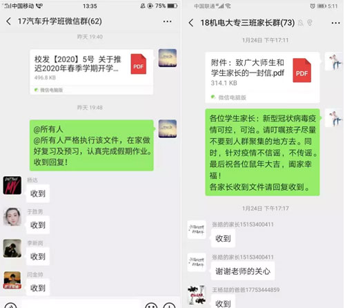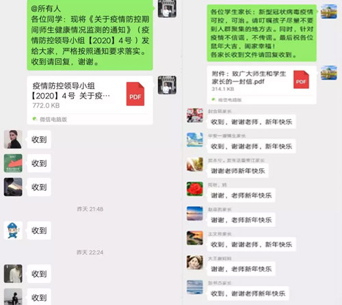 德州交專各班主任老師通過微信群與每位學生保持常態聯系,在大年三十發布了《致廣大師生和學生家長的一封信》,之后下達學校疫情防控領導小組的各項文件,解答學生的各類問題,了解學生寒假期間學習生活情況。