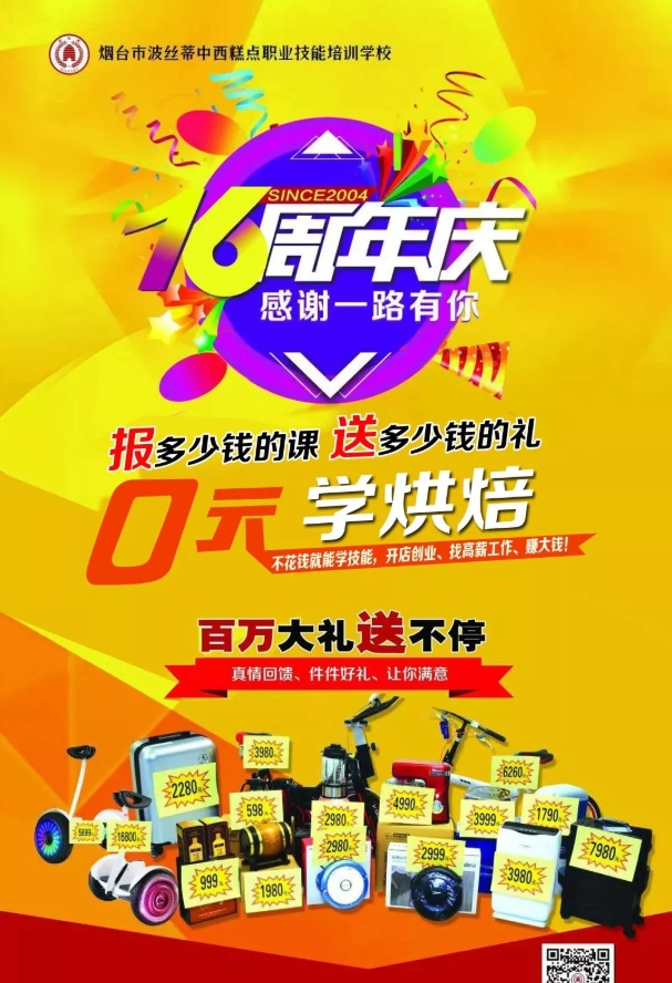 煙臺市波絲蒂中西糕點職業技能培訓學校創立于2004年,是中西糕點專業培訓機構,是煙臺市人力資源和社會保障局指定的正規技能培訓基地。西點課程設置全面:面包專科班、蛋糕專科班、休閑干點班、月餅專科班、披薩專科班、裱花專科班、法式甜品專科班、韓式裱花班、休閑飲品咖啡班、健康日式面包提升班、私房創業綜合班、業余西點流行班等等。