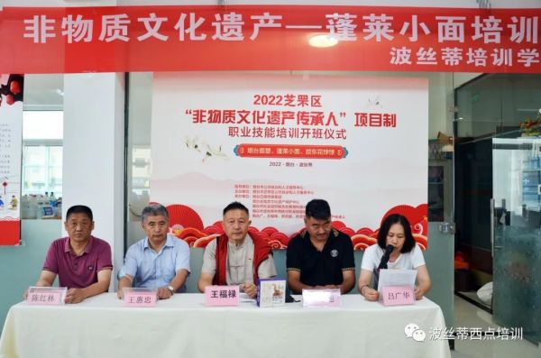 非物質文化遺產·蓬萊小面制作技藝傳承人王福祿老師(中),煙臺魯菜研究所副所長王惠忠(左二),煙臺波絲蒂中西糕點職業技能培訓學校(煙臺波絲蒂面點培訓、煙臺西點培訓)校長陳紅林(左一),本次培訓老師郝志超(右二)共同出席了開班儀式。