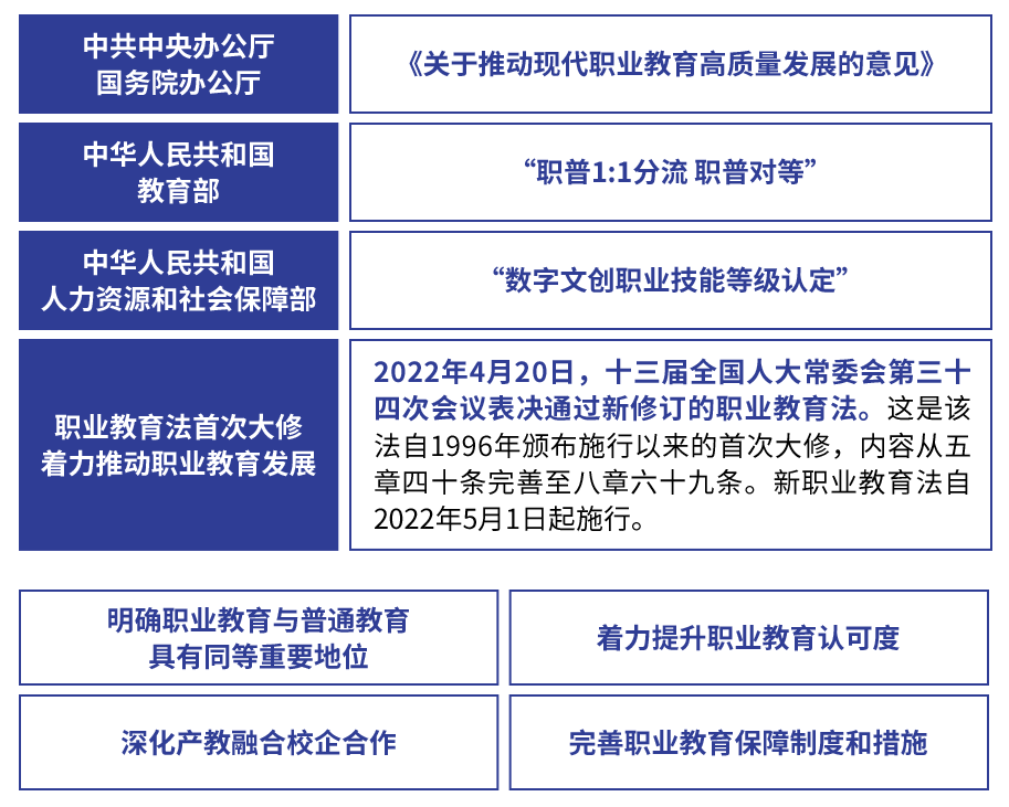 近年來國家出臺大量利好政策推動職業(yè)教育發(fā)展,中共中央辦公廳、國務(wù)院辦公廳印發(fā)了《關(guān)于推動現(xiàn)代職業(yè)教育高質(zhì)量發(fā)展的意見》,明確職業(yè)教育是國民教育體系和人力資源開發(fā)的重要組成部分,肩負著培養(yǎng)多樣化人才、傳承技術(shù)技能、促進就業(yè)創(chuàng)業(yè)的重要職責。在全面建設(shè)社會主義現(xiàn)代化國家新征程中,職業(yè)教育前途廣闊、大有可為。而在其中,數(shù)字文創(chuàng)新職業(yè)教育備受關(guān)注。