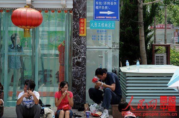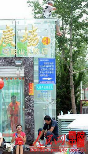 7月28日,濟南英雄山人防商場,一個老人要從6米高的玻璃房下跳下來,民警前來勸說,濟南電視臺的記者就坐在現場笑嘻嘻的吃喝等著報道。