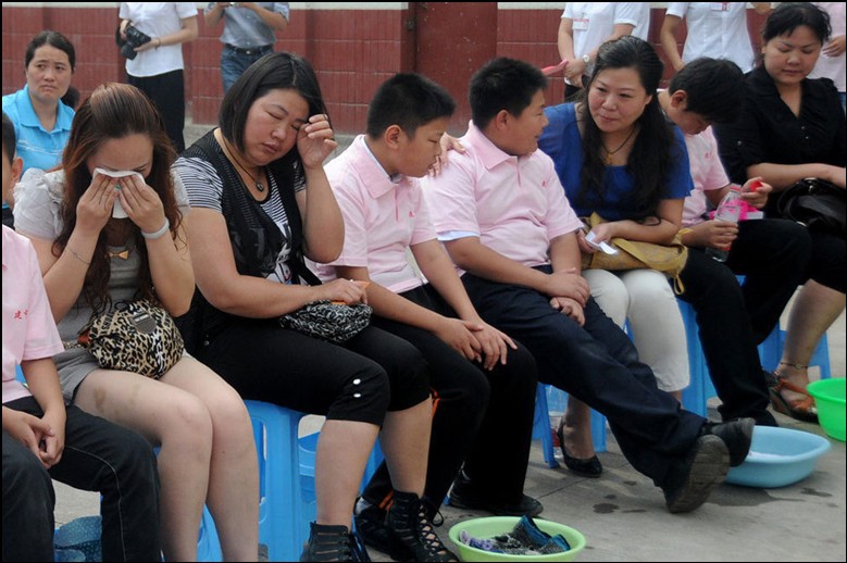 今天河南省洛陽建中實驗學校操場上百名學生集體給家長行跪拜禮、為家長洗腳。