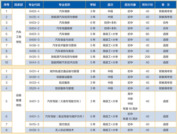 【主要課程】交通安全法規與管理,汽車運輸企業管理,客車駕駛人職業道德規范,大客車構造,大客車維護,大客車防御性駕駛技術,大客車駕駛操作技術(含基礎駕駛,一般道路駕駛,場地式樣駕駛,城市道路駕駛,長途駕駛,夜間駕駛等),交通客運服務禮儀,城市軌道交通安全管理,城市軌道交通乘客服務,城市軌道交通票務服務,城市軌道交通車站行車服務,城市軌道交通站務應急處置作業,電子售票實務,高鐵旅客運輸服務,高鐵服務專業禮儀,鐵路服務與應急處理,形體訓練,餐飲服務與管理,民航概論,禮儀與演講口才,航空服務專業禮儀,電子售票實務,航空客艙服務實務,航空服務與應急處理實務,航空客運安檢實務等。