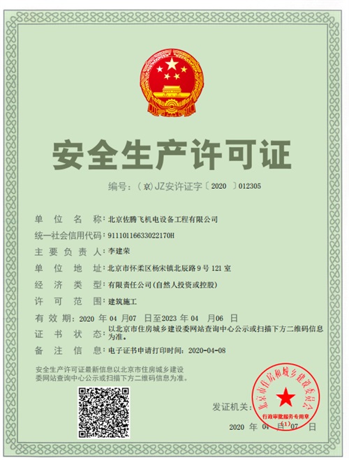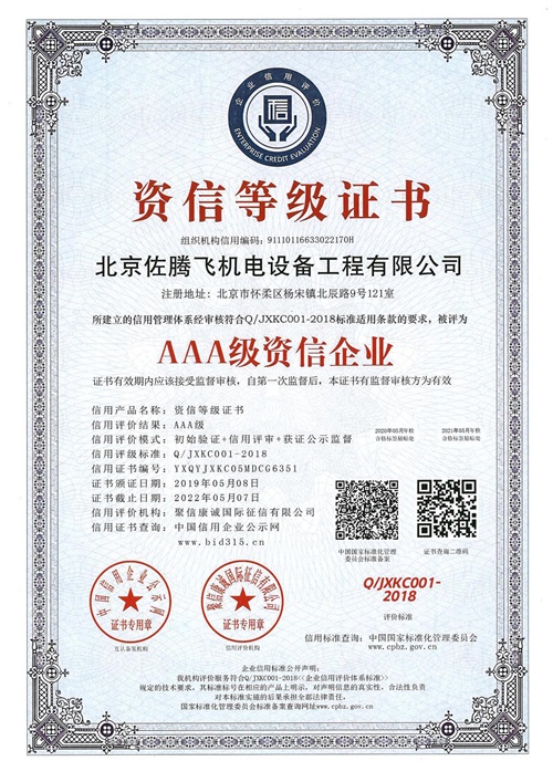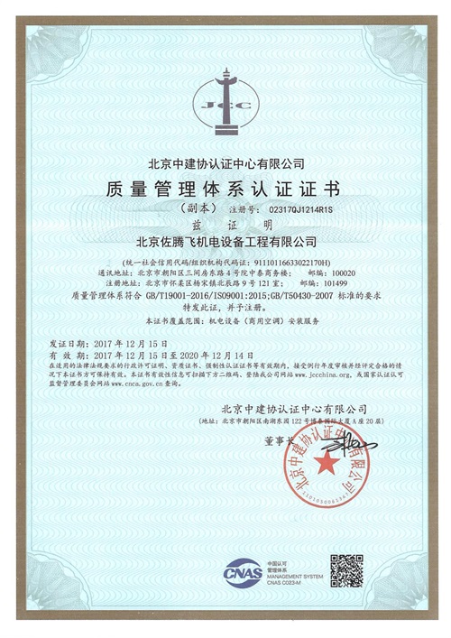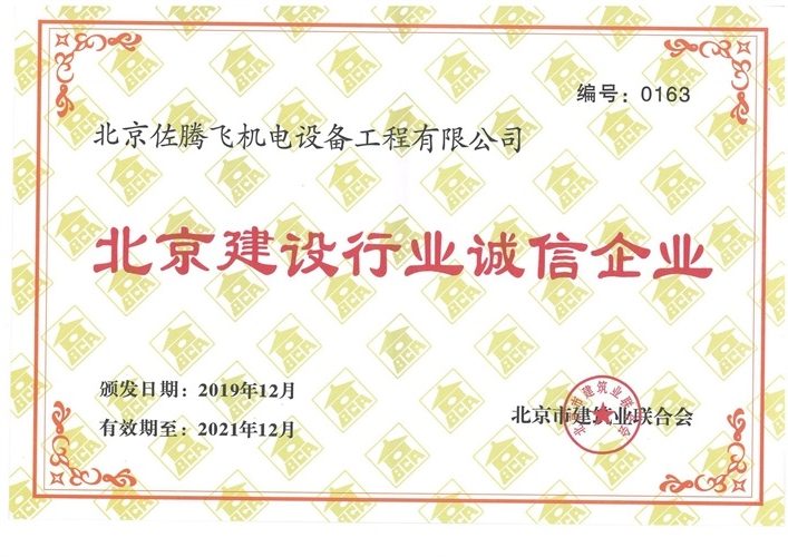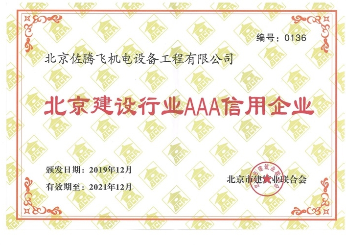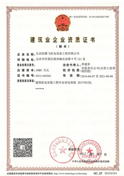 公司還擁有以下資質(zhì)證書:機(jī)電安裝施工叁級(jí)資質(zhì)、質(zhì)量管理體系認(rèn)證(ISO9001)、環(huán)境管理體系認(rèn)證(ISO14001)、北京市建設(shè)行業(yè)AAA誠信企業(yè)認(rèn)證、北京市國家稅務(wù)局頒發(fā)納稅A級(jí)企業(yè)。