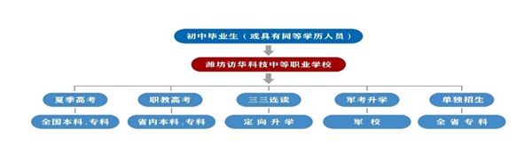 學生在校系統培養3年,實行高中管理模式。3年屆滿參加全國統一高考或者單獨招生考試直接升入專科院校學習,學校與山東畜牧獸醫職業學院、山東經貿職業學院、山東科技職業學院、濰坊工程職業學院、青島遠洋船員職業學院、日照航海工程職業學院等多所高職院校簽署聯合辦學分段培養協議。