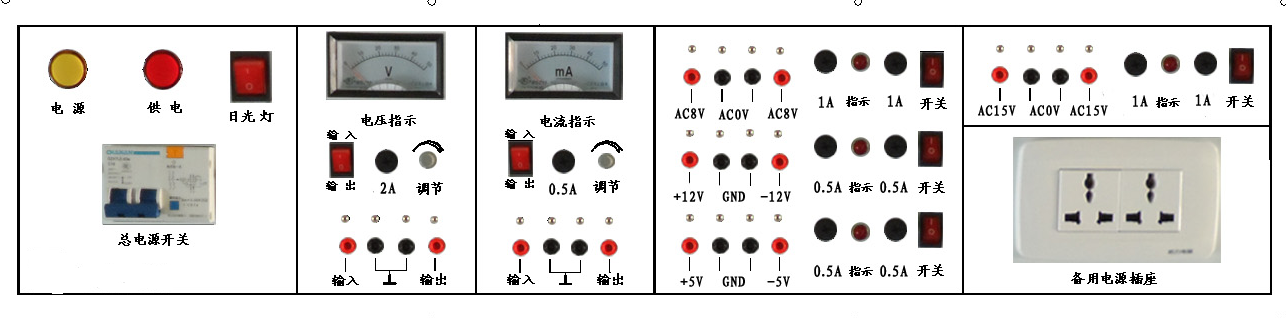 考試工作臺面板如上圖所示,配置有兩路可調直流電源,±5V、±12 V直流電源,雙8V交流電源,雙15V交流電源,220V交流電源,以及開關、指示燈、顯示儀表等。