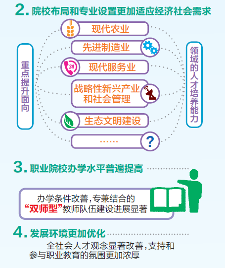 “推行產教融合的職業教育模式”“建立健全對接產業發展中高端水平的職業教育教學標準體系”“完善職業學校教學工作診斷與改進制度”……《國家教育事業發展“十三五”規劃》中,對未來職業教育發展的方向明晰而具體。