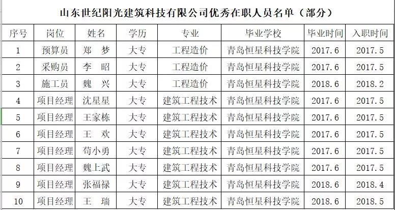 2017年5月青島恒星科技學院與山東世紀陽光建筑科技有限公司建立校企合作關系以來,青島恒星科技學院先后向山東世紀陽光建筑科技有限公司輸送20多名優秀畢業生。山東世紀陽光建筑科技有限公司成立于2003年,具有建筑裝修裝飾工程專業承包二級資質、防水防腐保溫工程專業承包一級資質。恒星學院聯合世紀陽光建筑科技有限公司對恒星畢業生進行系統的崗前培訓,確保同學們順利上崗。