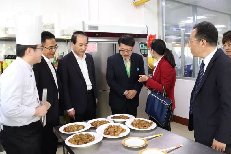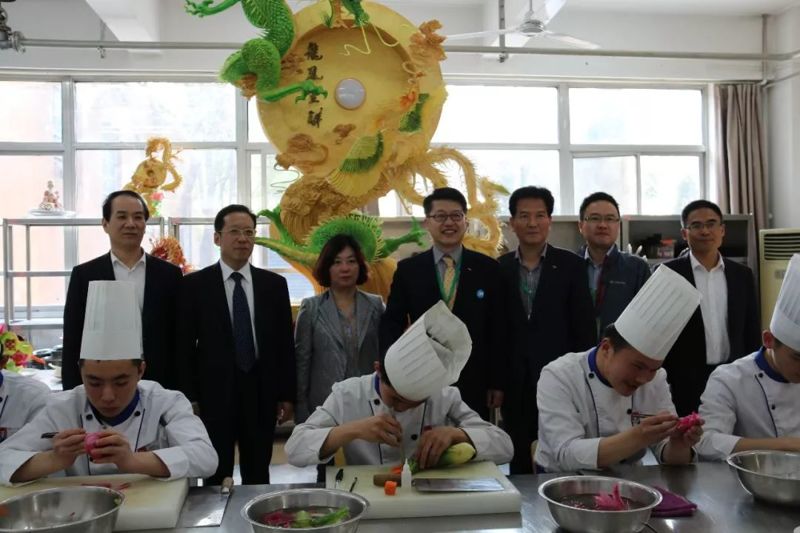 4月19日下午,在市外事辦副調研員徐燕的陪同下,韓國楊州市副市長金大淳一行5人來學校參觀訪問。校長任典云等校領導陪同客人參觀了山東藍海職業學校中餐烹飪、面點實訓室、名師食品雕刻室,觀看了老師和同學們烹飪和食品雕刻表演并品嘗學生制作的菜品,對學校產教融合、產學結合的辦學特色給予高度贊許。