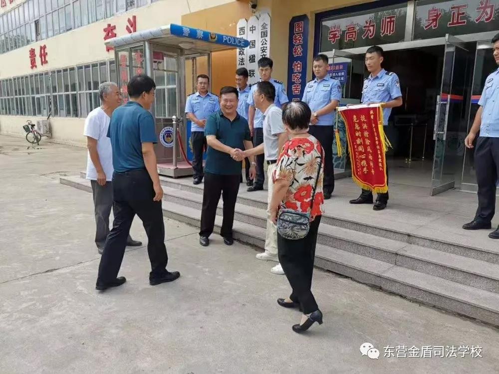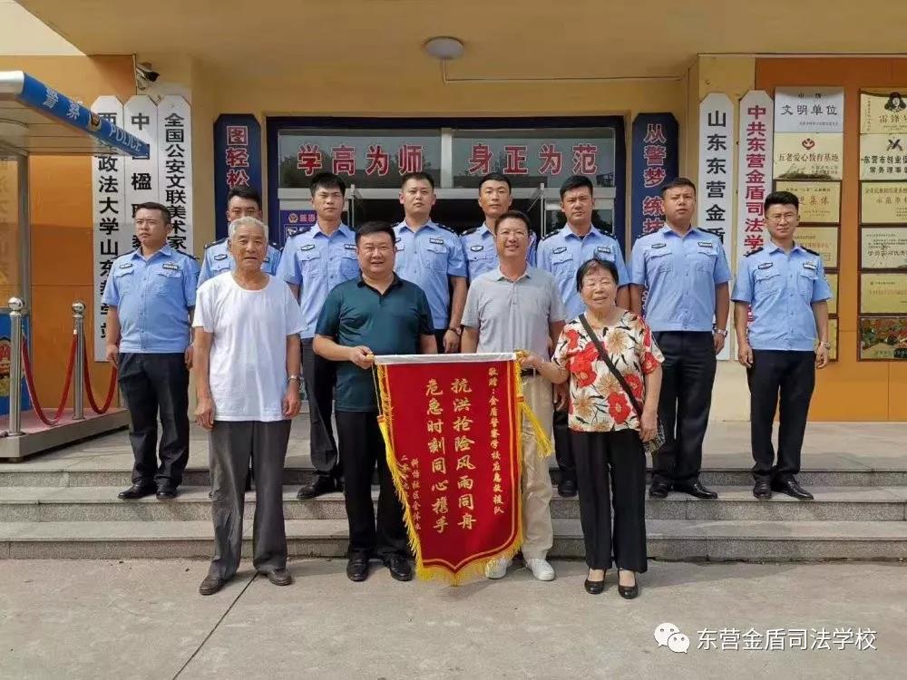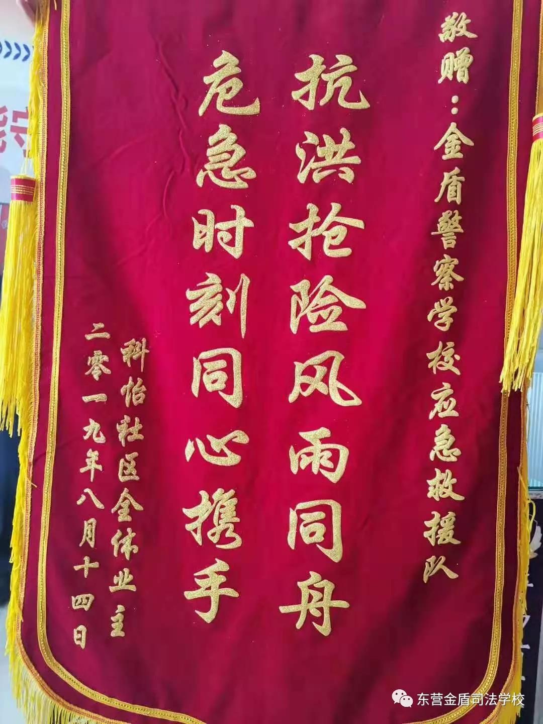 山東東營(yíng)金盾司法學(xué)校楊萬(wàn)里校長(zhǎng)與抗洪救災(zāi)的主力軍們一起接受了錦旗,并表示將以更熾熱的情感為社會(huì)貢獻(xiàn)金盾力量。