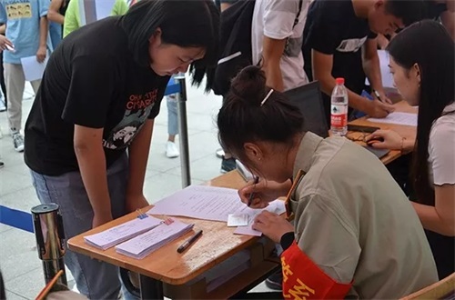 紅色的迎新條幅、貼心的指示標語,各院系的迎新工作人員和學生志愿者熱情引導,校園里四處洋溢著歡樂、溫馨、和諧的氣氛。