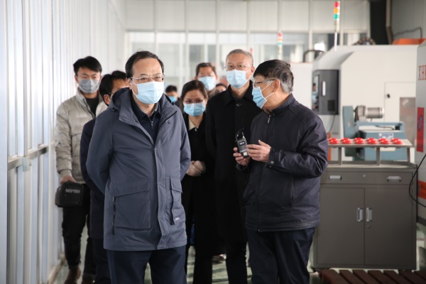 于杰副省長(左一)等領導考察我校五軸加工中心