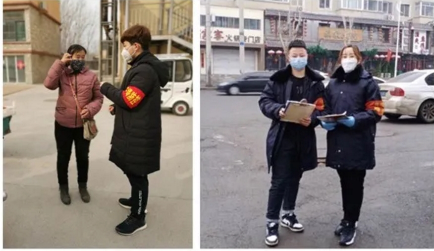 公路工程系志愿者們為出入小區的人測體溫、消毒