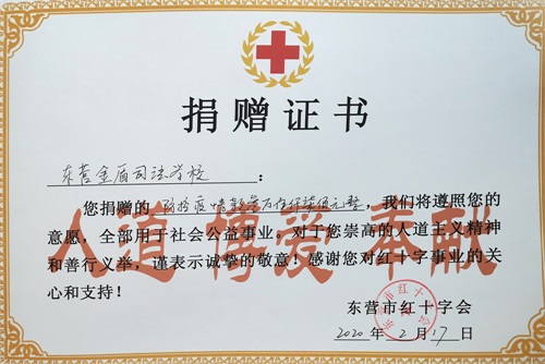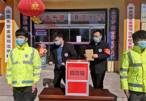 山東東營金盾司法學校第一時間將這筆善款捐贈給東營市紅十字會,助力東營防疫,向東營“疫”線工作人員表達最崇高的敬意。在本次捐款前學校防疫應急服務隊已在各自崗位上奮斗了二十多天,并以無償獻血、捐款捐物的方式助力防疫工作。本次捐款掀起了山東東營金盾司法學校助力防控工作的又一次高潮。