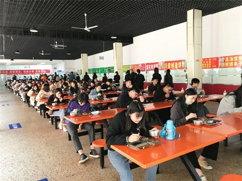 學生在教室門口集合,以班為單位排成兩隊且間隔1米以上,分時段、分批次在班主任的帶領下有序前往餐廳。按照就餐指示牌,依次取餐,學生就餐時,嚴格按照標簽的張貼位置,單人單桌,間隔1米以上同方向就餐。