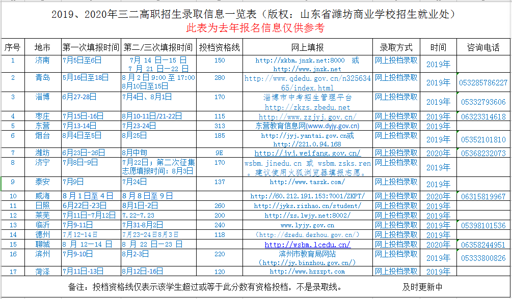 2020年我校在山東省內其他地市,都有三二連讀招生計劃。外地市大部分都是中考結束后報志愿,各地市的填報志愿時間進度不一樣,大部分沒有公布,但都是填報兩次志愿。現把2019年的志愿填報錄取時間信息發給大家,供參考。
