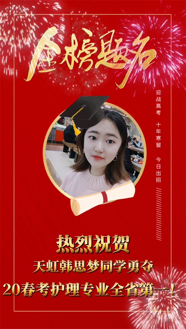 護理專業(yè):韓思夢同學(xué)勇奪全省第一,該專業(yè)包攬全省第一、二、三、五名,42人進(jìn)入全省前100名 ,71人進(jìn)入全省前200名!本科上線率高達(dá)81.8%!