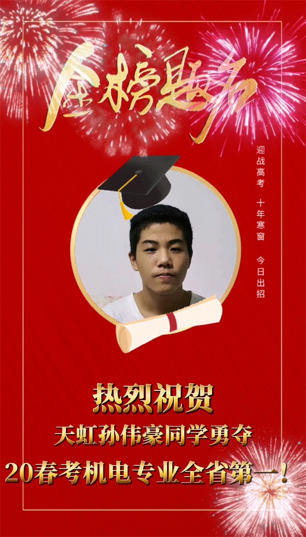 機電專業(yè):孫偉豪同學(xué)勇奪全省第一,該專業(yè)包攬全省前3名,7人進(jìn)入全省前10名,40人進(jìn)入全省前100名,87人進(jìn)入全省前200名!本科上線率高達(dá)93.2%!