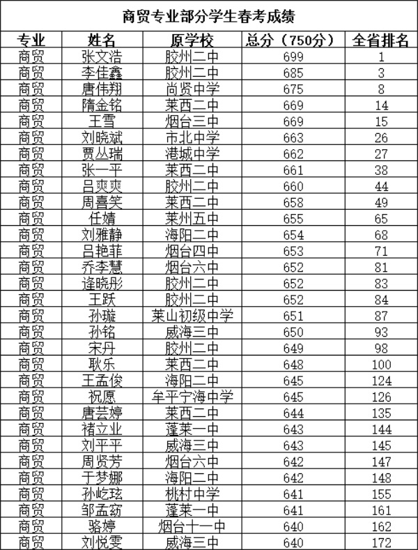 在參考的五個專業(yè)中,斬獲商貿(mào)、護理、機電三個專業(yè)的全省最高分!同時獲得2個全省第二名,3個全省第三名!16人進(jìn)入全省各專業(yè)前10名,114人進(jìn)入各專業(yè)全省前100名!