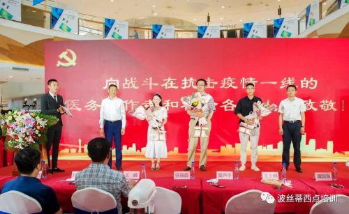 大賽邀請了煙臺市芝罘區毓璜頂醫院援鄂醫護人員代表毓璜頂醫院全科醫學副主任翟聲平、重癥醫學科護士任福磊、呼吸內科護士王少琳來到活動現場,向他們送上了鮮花和蛋糕,另外,波絲蒂西點學校還特意為三位抗疫英雄及其家人準備了蛋糕全家福卡,這個福卡包含了三位醫護人員及家人一年的生日蛋糕,逢生日時到波絲蒂西點學校免費領取即可。