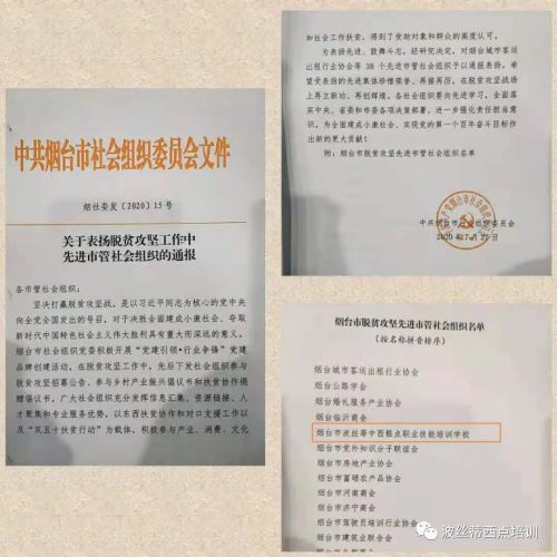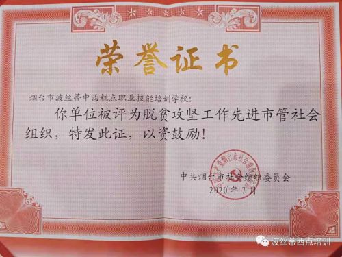 近日,煙臺市社會組織委員會發(fā)布《關(guān)于表揚脫貧攻堅工作中先進市管社會組織的通報》(煙社委發(fā)〔2020〕15號),表揚了38個2020年煙臺市脫貧攻堅先進市管社會組織,煙臺市波絲蒂中西糕點職業(yè)技能培訓學校因積極參與產(chǎn)業(yè)、消費、文化與社會工作扶貧,得到了受助對象和群眾的高度認可,并受到表揚。