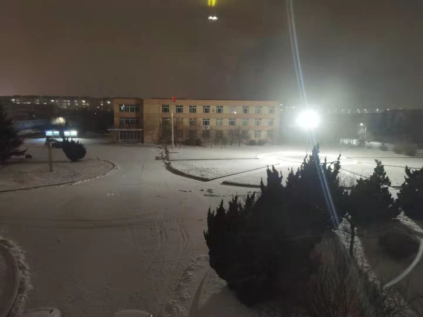 不知庭霰今朝落,疑是林花昨夜開!夜晚的山東龍口礦業集團高級技工學校在大雪的裝點下,展現出來又一番景象,白白的雪花飄灑下來,給黑夜里的校園多了一些新意,似乎是在向夜晚的校園獻舞,也讓這里變成了歡樂的海洋!