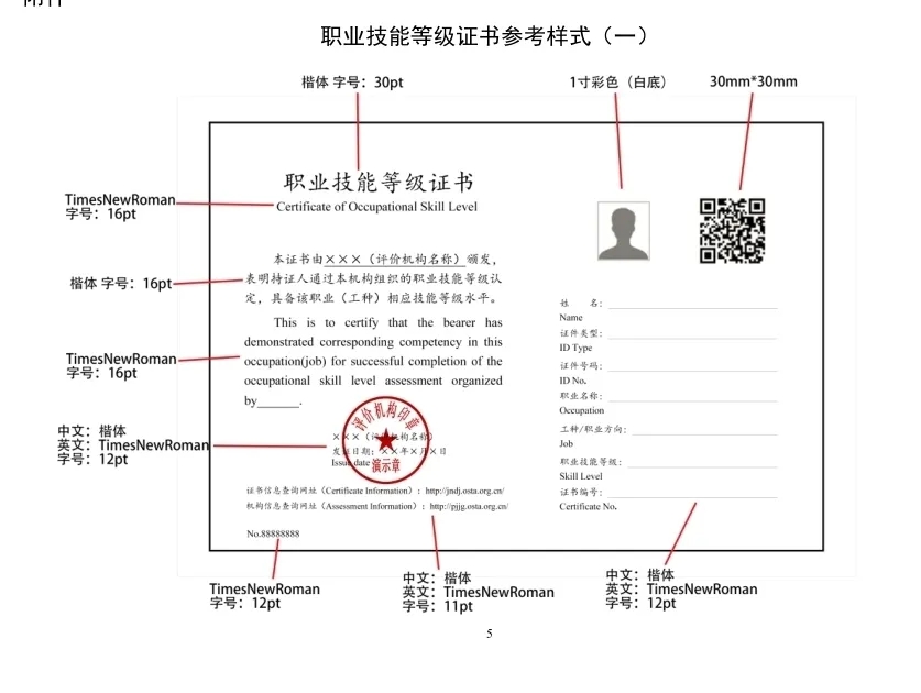 (一)證書應(yīng)包括以下內(nèi)容:證書名稱、證書正文、評價機(jī)構(gòu)名稱、發(fā)證日期、姓名、證件類型、證件號碼、職業(yè)名稱、工種/職業(yè)方向、職業(yè)技能等級、證書編號,以及持證人照片、二維碼、證書信息查詢網(wǎng)址(http://jndj.osta.org.cn)、機(jī)構(gòu)信息查詢網(wǎng)址(http://pjjg.osta.org.cn)。評價機(jī)構(gòu)可根據(jù)實際情況在證書上增加省(自治區(qū)、直轄市)人力資源社會保障部門證書查詢網(wǎng)址和證書印制流水碼。