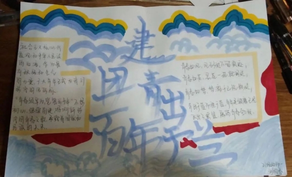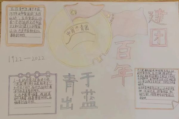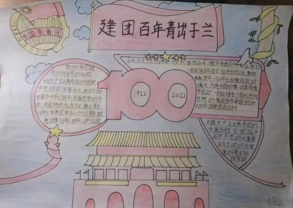 1922年5月5日至5月10日,中國社會主義青年團第一次全國代表大會在廣州東園隆重舉行。在中國共產黨直接領導下,中國共產主義青年團成立。由此,中國青年團組織正式誕生了,這是中國青年運動發展史上的一個里程碑。習主席曾寄語青年:“對想做、愛做的事要敢試敢為,努力從無到有、從小到大,把理想變為現實。要敢于做先鋒,而不做過客、當看客,讓創新成為青春遠航的動力,讓創業成為青春搏擊的能量,讓青春年華在為國家、為人民的奉獻中煥發出絢麗光彩!闭^,長江后浪推前浪,一代更比一代強。100年櫛風沐雨,共青團始終堅定不移跟黨走,團結帶領共青團員和廣大青年前赴后繼、勇當先鋒,書寫了中國青年運動的華章。在中國共青團成立100周年之際,為迎接黨的二十大勝利召開,大力弘揚和培育以愛國主義為核心的民族精神,團結引領廣大團員青年建功新時代、奮進新征程,提升團員青年的歷史責任感和使命感,臨沂沂蒙職業中等專業學校團委面向學校全體共青團員組織開展了慶祝中國共產主義青年團成立100周年主題繪畫(手抄報)活動,得到青年團員的熱烈響應。