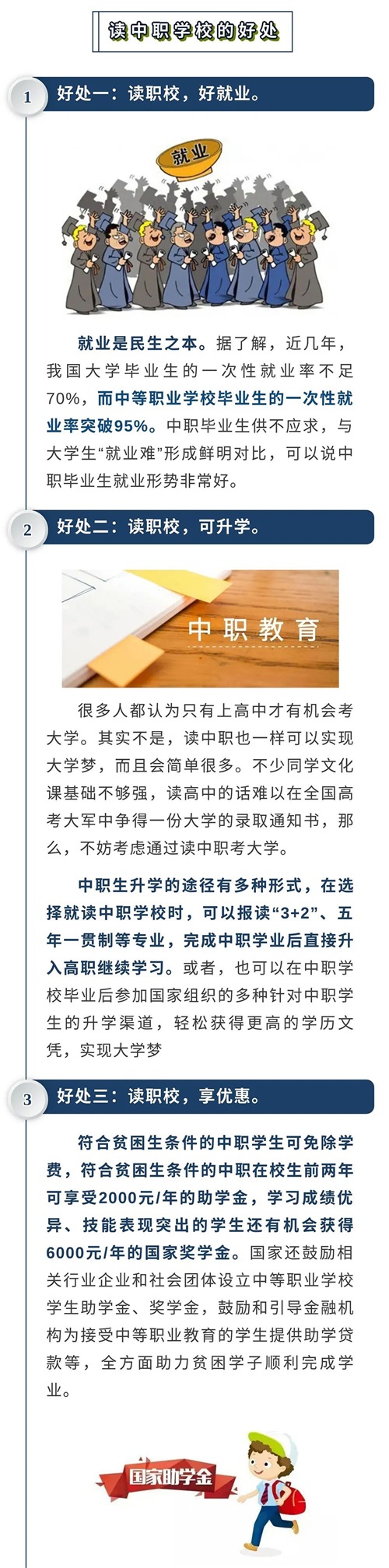 在國家的大力支持下,近年來中職畢業生既可以選擇就業,也可以選擇通過高職單招、職教高考就讀大學,出路十分寬廣和順暢,讀職高,學技術,升學就業兩不誤。只有根據自身基礎條件、能力特長、興趣愛好以及家庭經濟狀況,選擇最適合自己的教育方式,才能有助于自己走向成功。