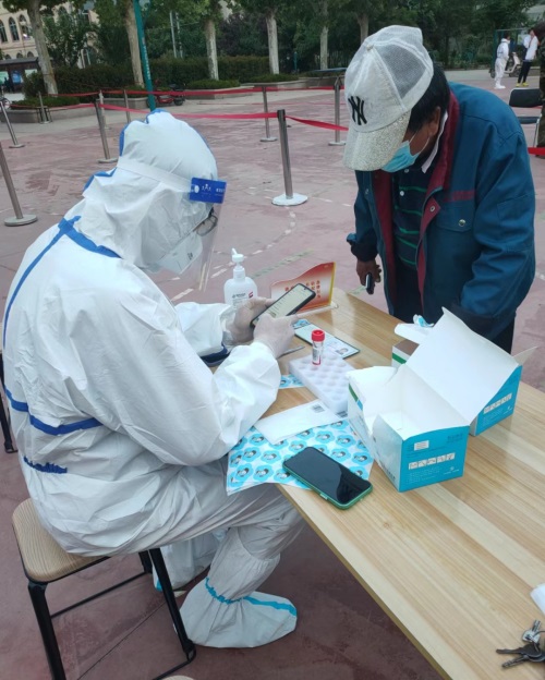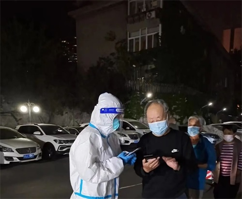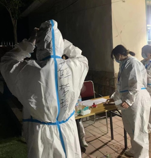 他們主要協助小區住戶進行每日例行核酸檢測。核實信息、發小粘貼、維持秩序等工作。身穿防護服連續工作數個小時是一項“艱巨的工作”,但是他們臉上依然掛著笑容,并且堅持下去,為社會和家鄉防疫獻出自己的一份力量。