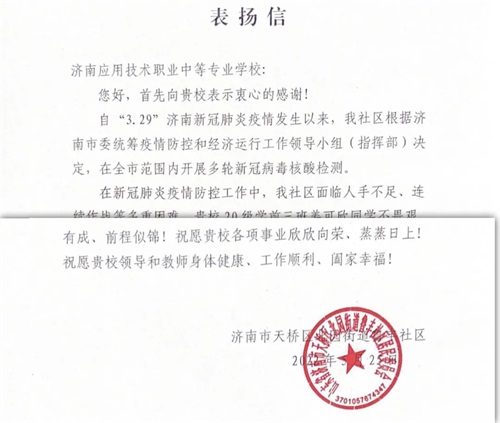 當疫情形勢穩定濟南應用技術職業中等專業學校復學后,其中3名同學在防疫志愿工作中的優異表現得到了當地街道居委會的認可,向學校發來了表揚信與榮譽證書,請大家為這6名防疫志愿者點贊。