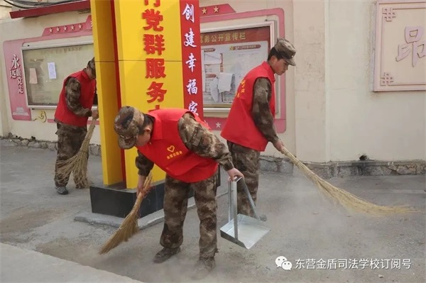 當天的活動以優化環境秩序為總目標,東營金盾司法學校三個大隊的同學們分成三個志愿服務活動小組。教導大隊前往東六戶村,主要負責對村委會及周邊地區進行野草清除、衛生清理;特警大隊前往西六戶村,開展衛生清理、野草清除和幫助村民們鋪磚的活動;綜合大隊前往的是六戶鎮,完成了對鎮街道路的清理和野草清除工作。