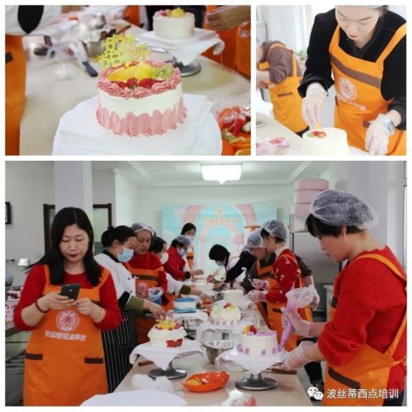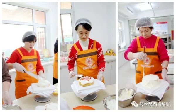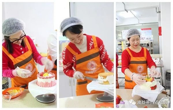 波絲蒂西點學校培訓劉君老師又為大家詳細示范了蛋糕的制作過程,就制作要點、烘焙材料進行了重點講解。大家學習了如何抹奶油、裱花裝飾、擺放水果等制作技巧,每個人都全身投入,精心制作。