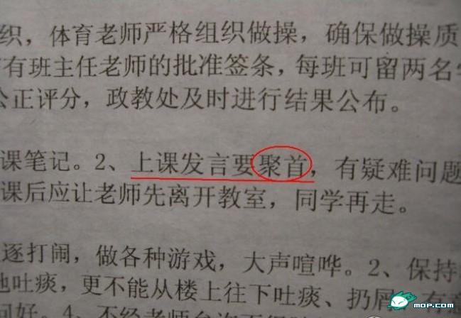 記得上學的時候老師要求上課要認真聽講,不許交頭接耳,你看人家這學校,連上課發(fā)言都要求“聚首”!“聚首”干嘛?商量商量再發(fā)言?看樣子應該是“上課發(fā)言要舉手”,盡管是印成了“聚集腦袋”,呵呵,純屬手誤、手誤哈!