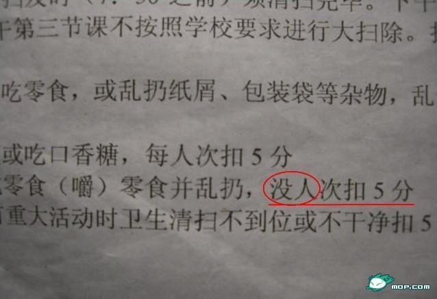 不以規(guī)矩,不成方圓,要求每個學生遵守校規(guī)是完全應該的,可也不能蠻橫到不講理的地步啊?大路不平有人踩,憑什么“沒人次”還要扣5分?當然啦,我知道老師是和學生們開了個玩笑,大概是“每人次”吧?哈哈……