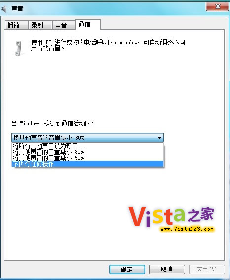 用戶不喜歡Windows 7在檢測到電腦內通話的時候自動降低聲音的這種功能么? 用戶可以關掉它。 右鍵單擊任務欄的音量圖標--聲音--通信 然后把它關掉。