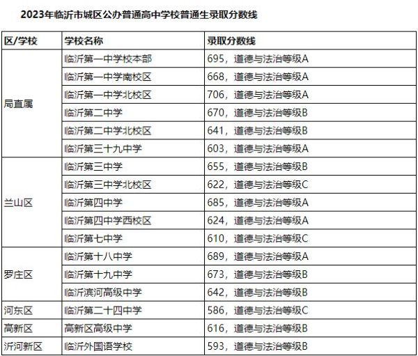 2023年臨沂市城區公辦普通高中學校普通生錄取分數線