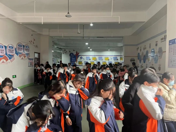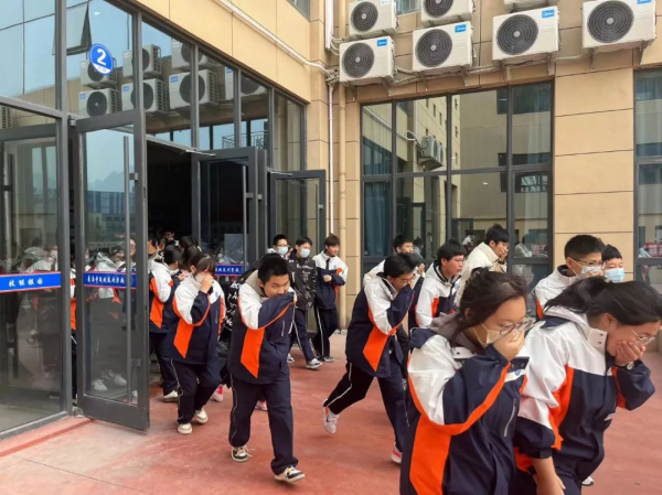 隨著急促的警報聲響起,老師們立即指導(dǎo)學(xué)生們用濕毛巾或衣服,捂住口鼻,貓腰躬身,按照預(yù)定路線迅速地撤離,責(zé)任老師、教官在樓梯口等關(guān)鍵部位進(jìn)行指揮,學(xué)生迅速的在最短的時間內(nèi)有序撤離教學(xué)樓并到達(dá)安全區(qū)域,各班立刻清點人數(shù),無一人掉隊。