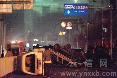 記者再次回到北倉村時,有4輛寫有“綜合執法”及“五華城管”等字樣的車被掀翻,其中一輛在燃燒。隨后趕到的消防官兵將火撲滅。