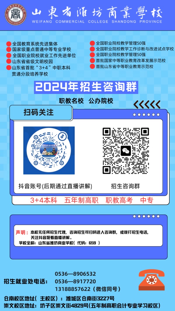 在這個(gè)信息時(shí)代,山東省濰坊商業(yè)學(xué)校積極擁抱新技術(shù),開(kāi)通了抖音直播群和咨詢?nèi)海罱ㄆ鹋c學(xué)生、家長(zhǎng)及社會(huì)各界溝通的橋梁。