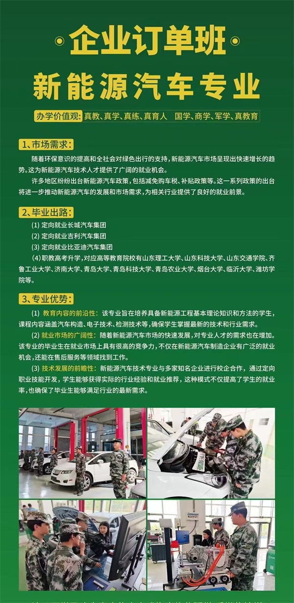 在軍智教(山東冶金技師學院)新能源汽車專業,每一份努力都在為未來積蓄能量,選擇“免學費訂單班”,意味著用三年時間掌握新能源汽車檢測、智能控制等核心技術;選擇“3+2/3+3連讀”,則能以更短周期獲得本科文憑,在車企研發、售后服務等崗位搶占先機。如果你對這所學校感興趣的話,現在就撥打屏幕上的電話進行咨詢吧。