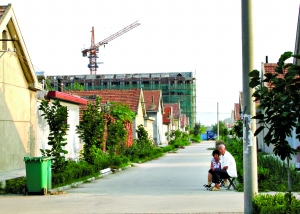 9月16日,諸城土墻社區,兩名農民坐在他們的庭院附近。不遠處,要讓農民集中住的樓房正在建設中。