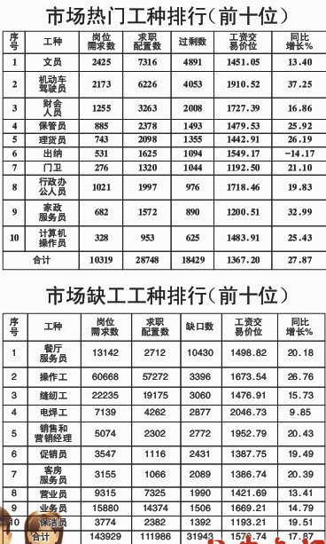 上半年調(diào)查中共有招聘工種507個(gè),均工資交易價(jià)位1716.81元,同比增長(zhǎng)18.46%!敖鼛啄昵鄭u的市場(chǎng)招聘工資平均漲幅雖然接近20%,但與求職者普遍要求工資2000元~2500元以上預(yù)期工資相比,企業(yè)招聘工資依然偏低!笔芯蜆I(yè)服務(wù)中心相關(guān)負(fù)責(zé)人表示,餐廳服務(wù)員、縫紉工等長(zhǎng)期缺工工種平均招聘工資均低于1500元,如果這些行業(yè)不能大幅提高工資待遇,招工難問(wèn)題很難得到根本解決。