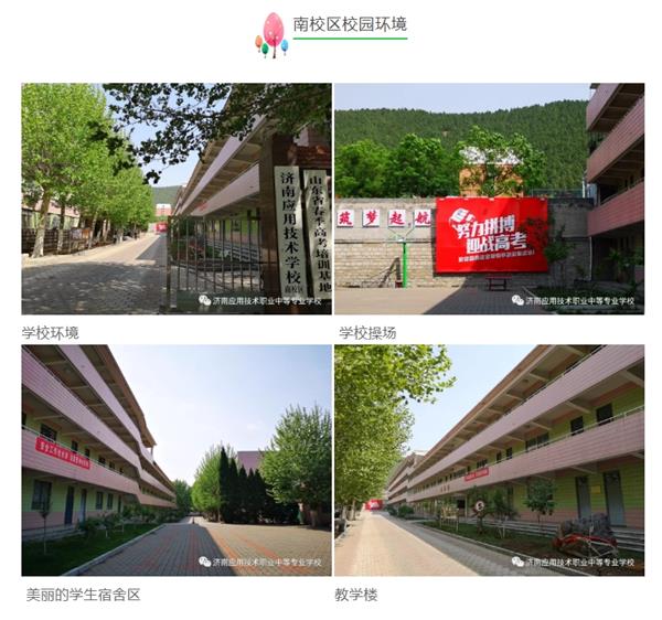 濟南應用技術職業中等專業學校分為南北兩個校區,均位于濟南市經濟文化發展的中心地帶,地理位置優越,交通便利、環境優美。南校區以升學為主,北校區以就業為主,兩校區總占地面積240余畝,建筑面積47000平方米,現有各類在校生5000人,教職員工300余人。