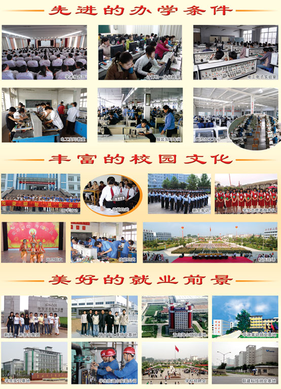 學(xué)校基礎(chǔ)設(shè)施完善,擁有教學(xué)樓、辦公樓、禮堂、實習(xí)車間、學(xué)生公寓、校園電子寬帶網(wǎng)絡(luò)等先進教學(xué)設(shè)備。擁有一支愛崗敬業(yè)、專業(yè)及配備齊全的師資隊伍,并根據(jù)需要聘請專家、學(xué)者及專業(yè)技術(shù)人員到校任教。學(xué)校領(lǐng)導(dǎo)班子團結(jié)向上,經(jīng)驗豐富,精于管理,富于開拓。