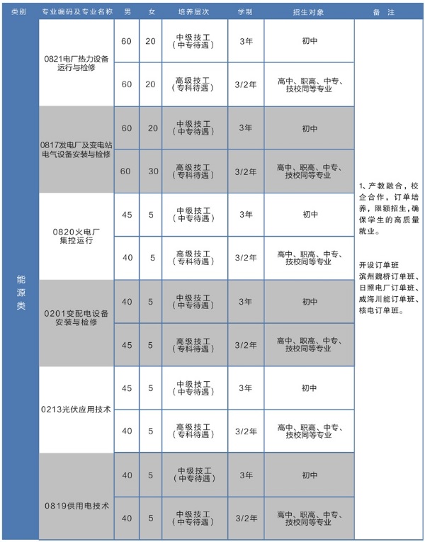 近年來山東煤炭技師學院電力工程系依托辦學優勢,適應市場發展的需求,大力加強新能源科學與工程、火電廠熱力設備運行與檢修、火電廠集控運行、發電廠及變電站電氣設備安裝與檢修、供用電技術、生物制藥、幼兒教育、計算機網絡應用、電子商務、新能源汽車、人工智能、工業機器人等方向的專業建設,簽訂校企合作協議。大力推進電力“新型學徒制”教學精品班,深化工學一體化教學。秉承校企合作、高薪就業、終身服務的理念,先后與省內外央企、國企、地方國企、大型民營企業等110余家知名企業(中國節能集團、青島電廠、日照電廠、海信集團、川能集團、世界五百強魏橋集團、京東集團、格力集團等),簽訂了合作培養協議建立良好的培訓就業關系,學生畢業即就業。