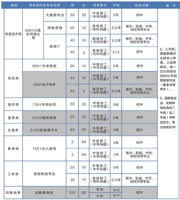 1、初中起點3年制為中級技工(中專待遇),5年制為高級技工(?拼觯;高中起點3年制為高級技工(?拼觯;初中起點3+2為前三年中級技工(中專待遇),后兩年高級技工(專科待遇)的培養模式。