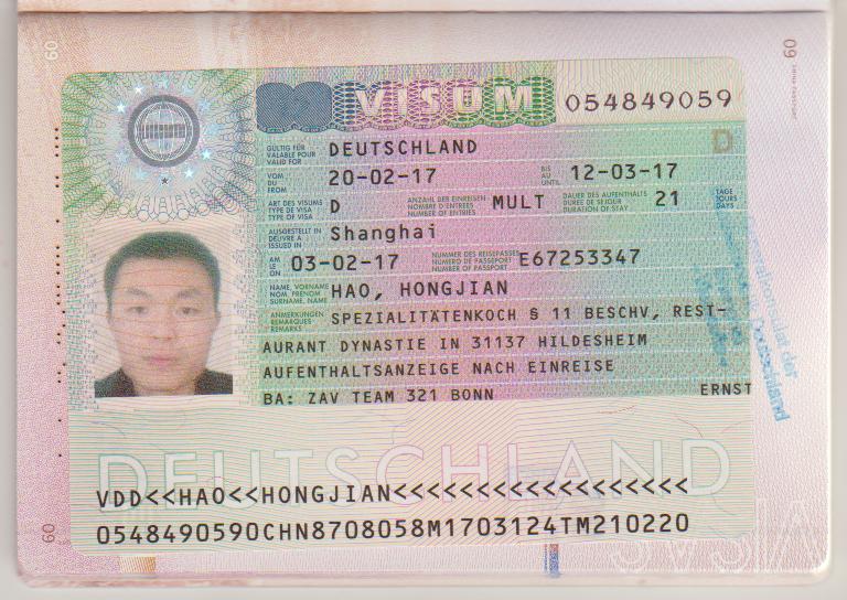 江蘇省連云港廚師范新海2017年02月22日獲得簽證,赴德國杜塞爾多夫藝酒樓工作