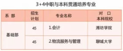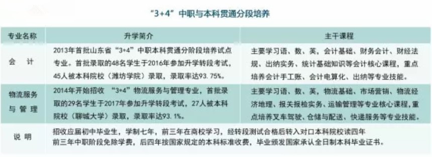 3、3+4中職與本科貫通培養(yǎng)學(xué)生三年中職階段后經(jīng)過測(cè)試合格可升入濰坊學(xué)院或聊城大學(xué)讀四年,取得本科學(xué)歷。