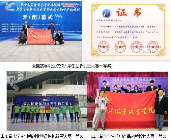 學校注重培養學生創新創業觀念,積極組織學生參加科技創新實踐活動,各二級學院學生創新創業實踐團隊先后獲得全國高等職業院校大學生創新創業大賽一等獎、山東省大學生裝備制造業創新大賽一等獎、山東省大學生創新創業沙盤模擬經營大賽一等獎、山東省大學生機電產品創新設計大賽一等獎等各獎項。